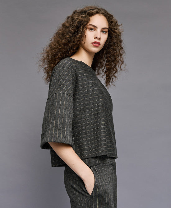 Striped cropped blouse with boat neckline and wide 3/4 sleeves with turned-up hems. Pair it with the matching pants from our collection for stylish all-day looks.