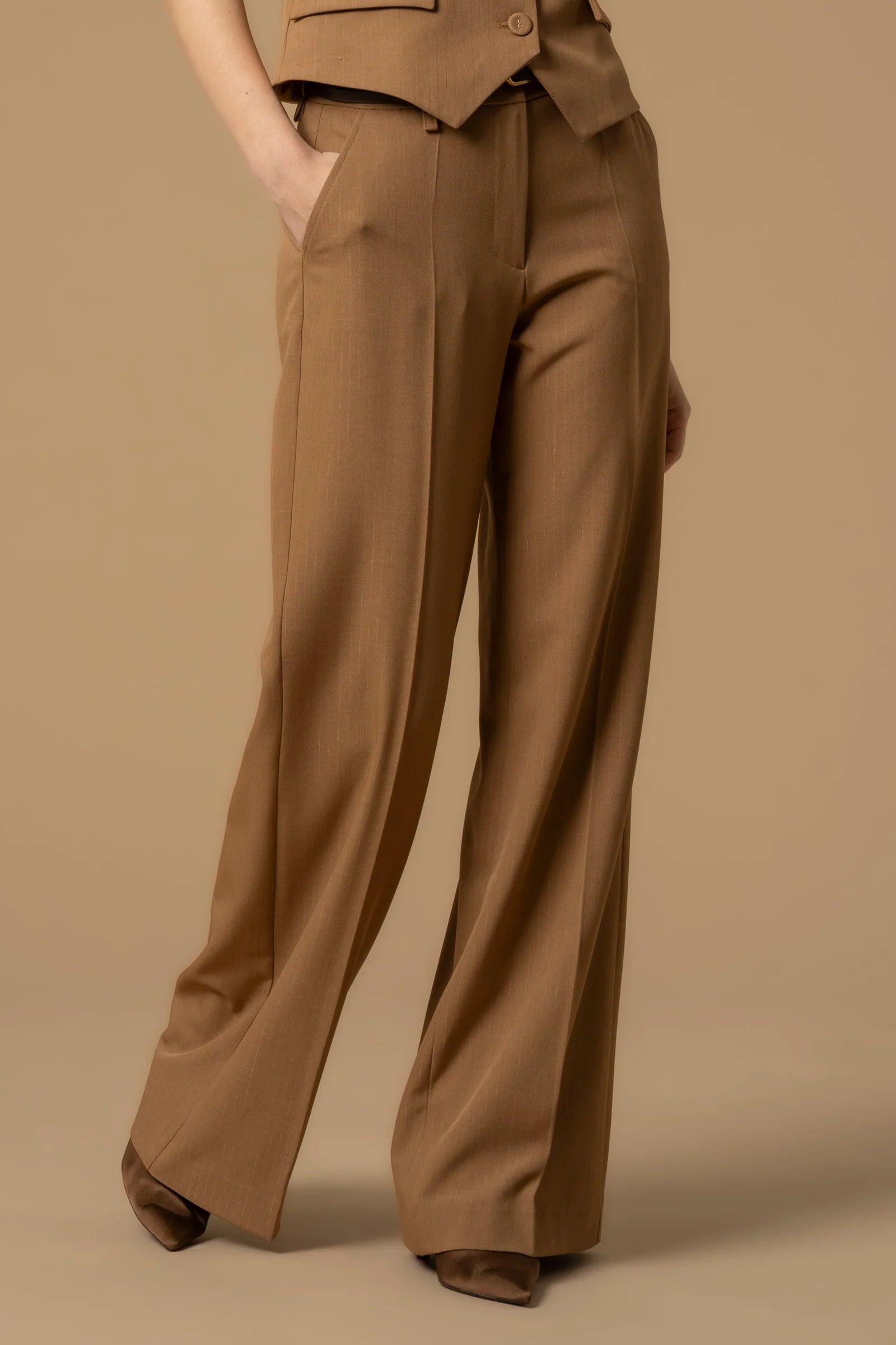 Fashionable full length trousers from Pure Verve Capsule collection, color coordinated belt and loops, front creases, flared ankle, tailored finish