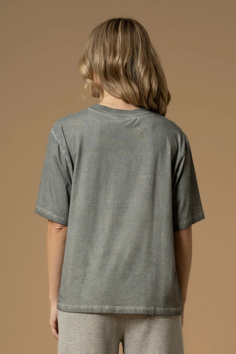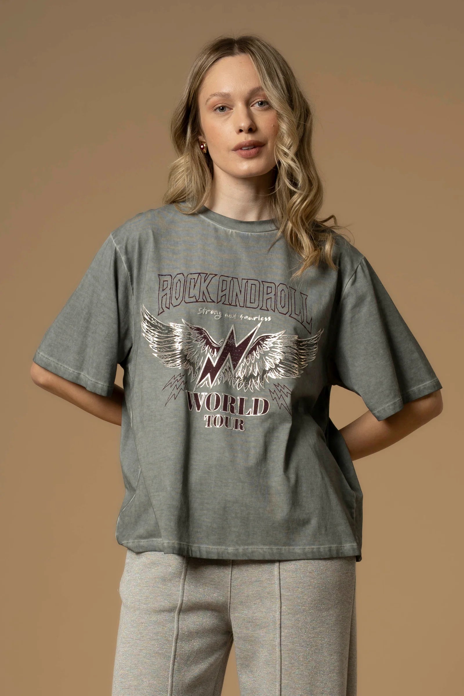 Classic round neck t-shirt, elbow length sleeves, Rock Androll World Tour and graphic on front, banded double stitched edging