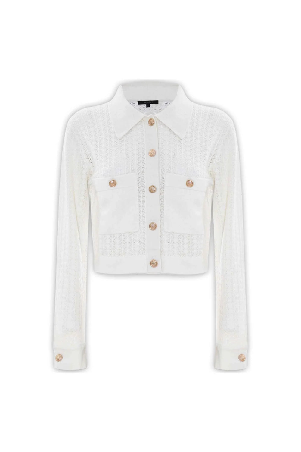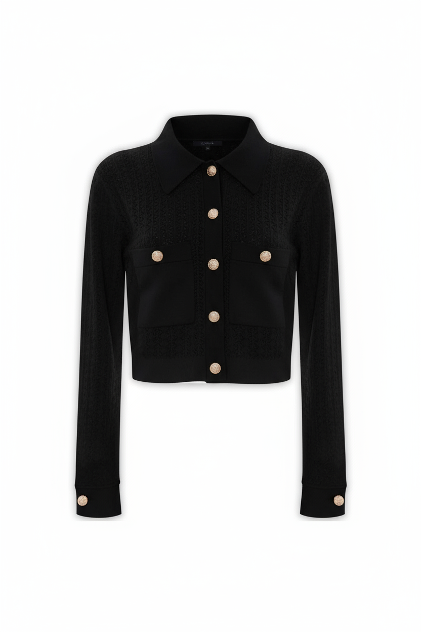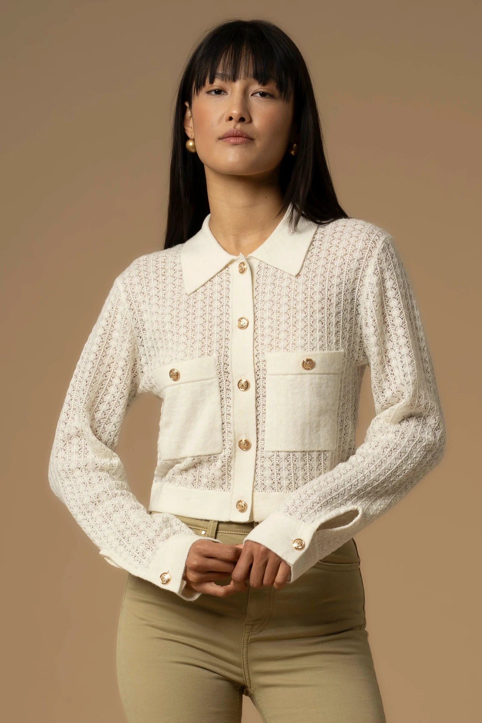 Cool shirt-style long sleeved sweater, five ornate button closure, twin front pockets, shirt style lapels, knit finish, large collars