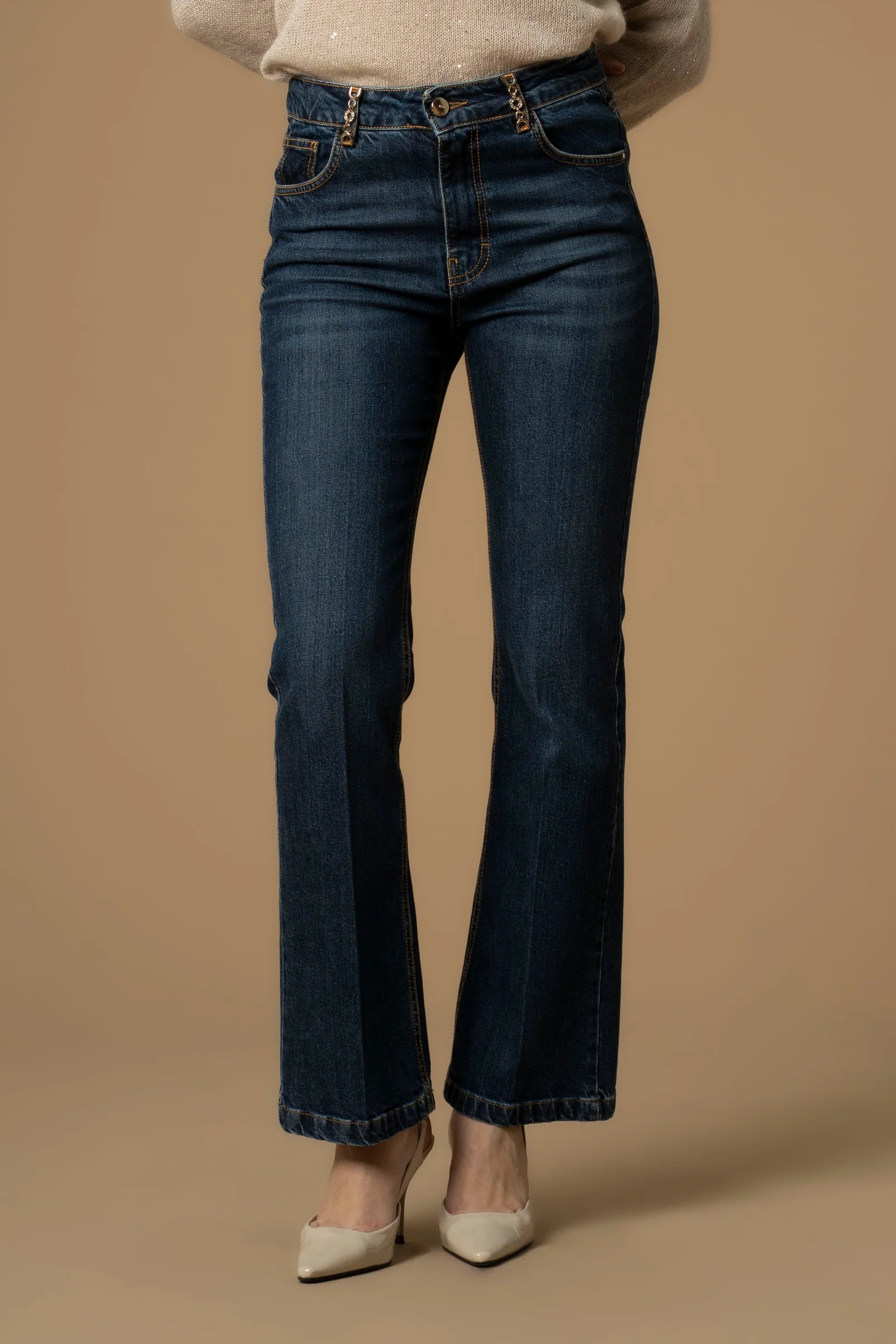Classic full length denim trousers, straight leg, slightly flared hems, slim fit, chrome button closure, jewel effect on belt loops