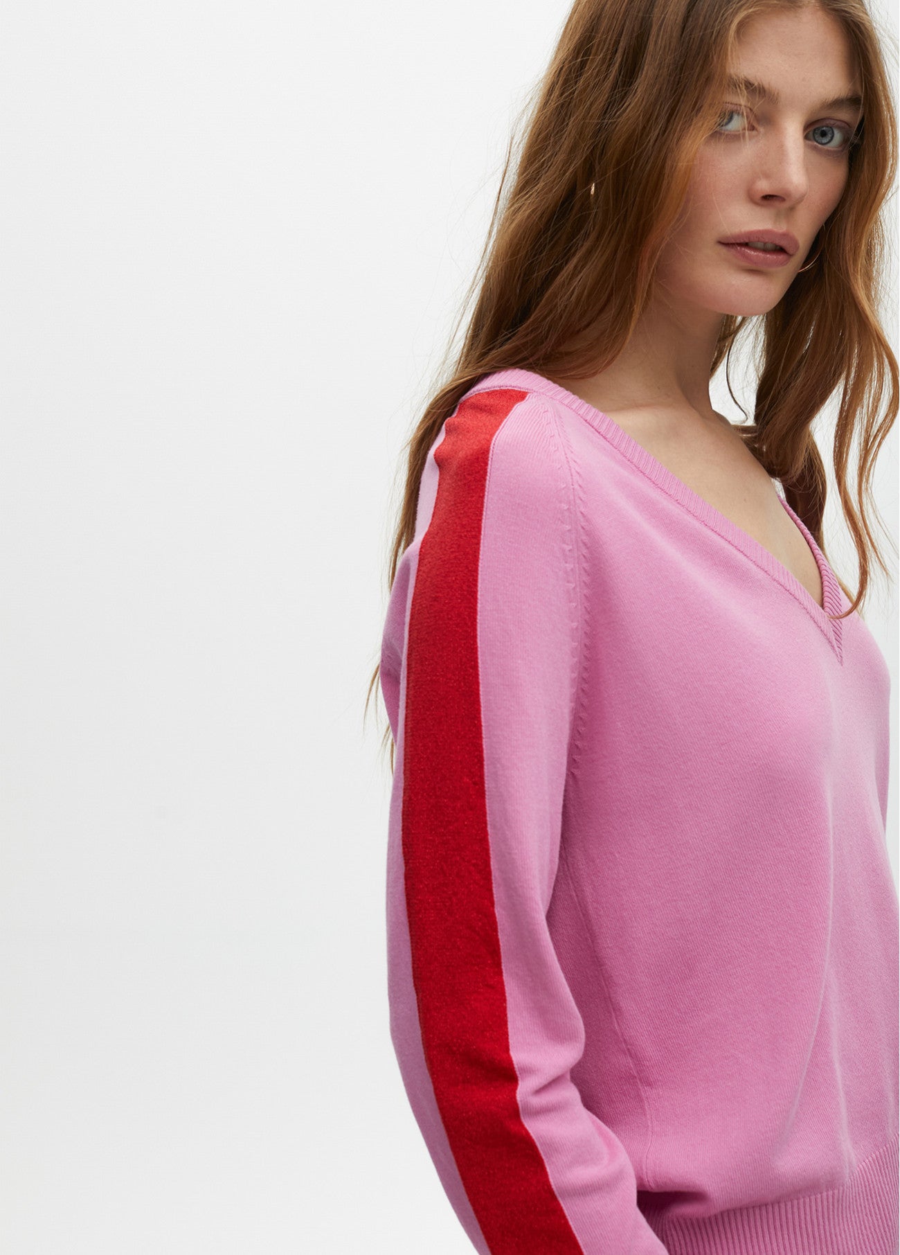 Soft knit sweater with V-neck and contrasting color details on sleeves. Designed in vibrant tones with comfortable fit and ribbed hem. Perfect for a casual, modern look.