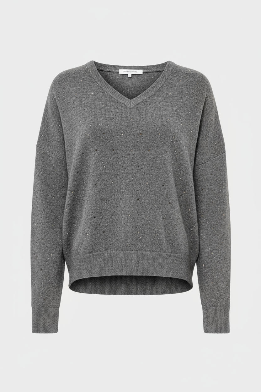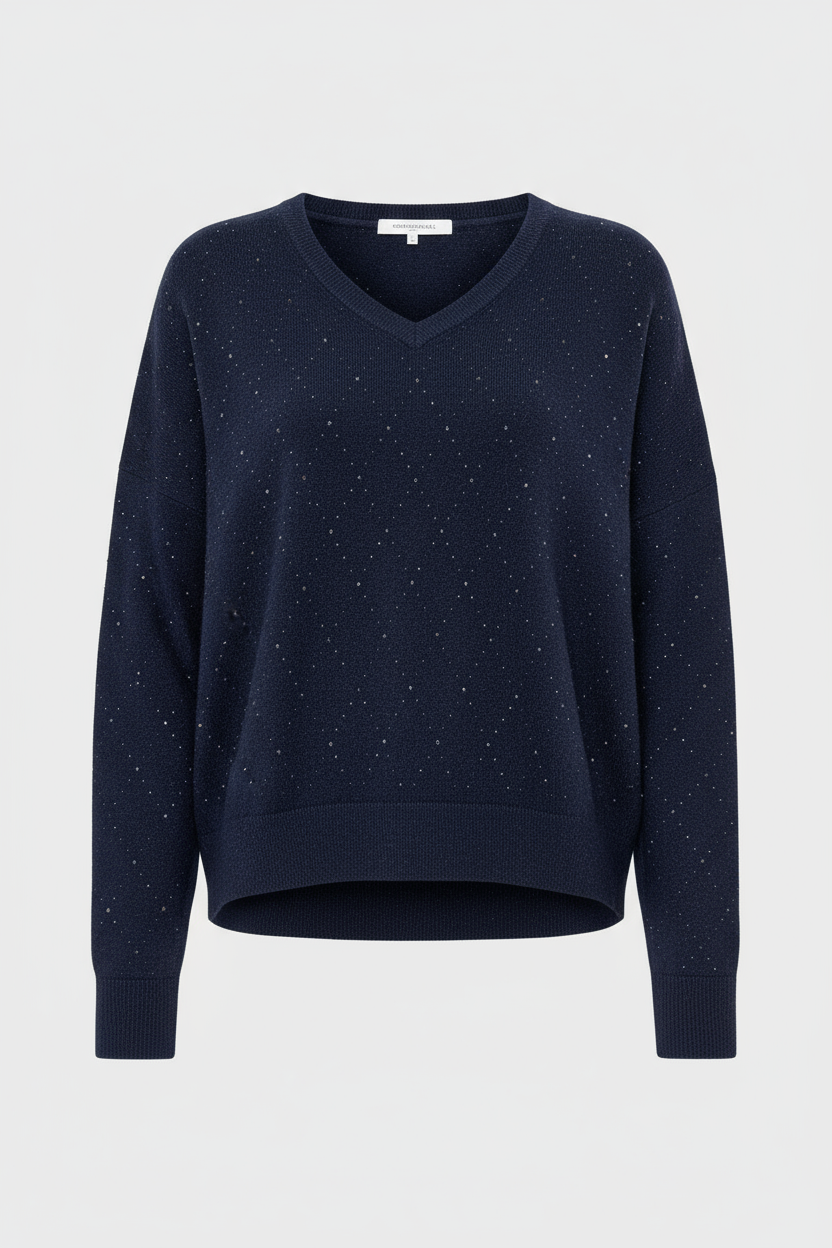 Crafted from 100% black wool, the Edwige sweater is adorned with cross-shaped rhinestones for a chic and whimsical touch. Its V-neck and dropped shoulders provide a contemporary and feminine look.