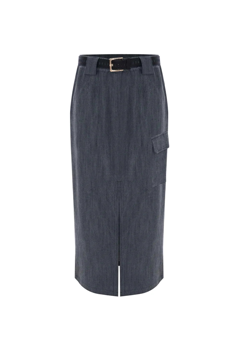 Stylish ankle length pencil style skirt, front slit, double stitched tailored edging, wide waist band with belt loops, contrasting belt