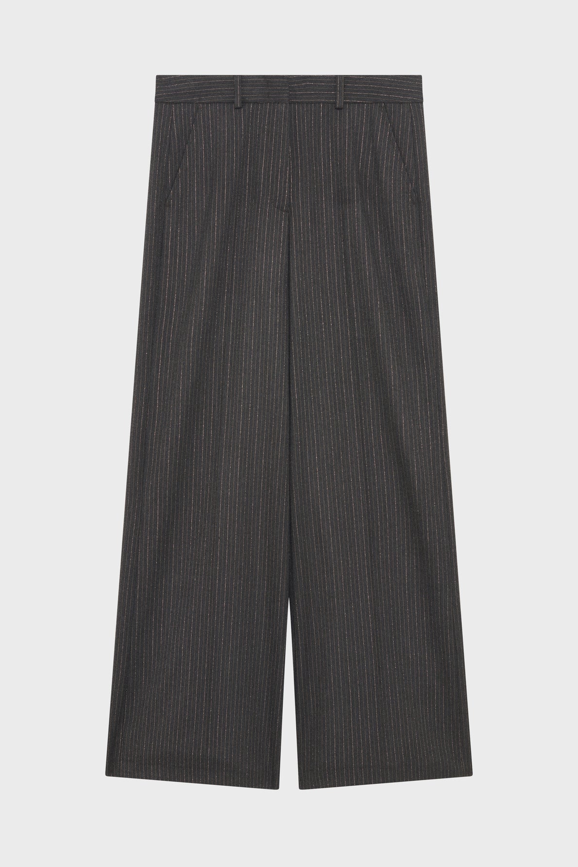Wide-leg charcoal suit pants, adorned with pinstripes and lurex for a touch of whimsy.