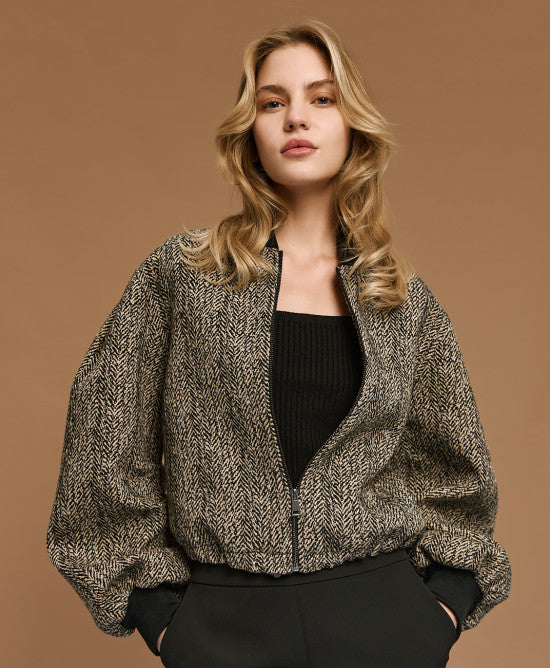 Cropped bomber jacket with herringbone weave and long puff sleeves with ribbed cuffs. Featuring a ribbed neckline, rhinestone details, and an adjustable drawstring hem. A perfect choice to complete your looks with style.