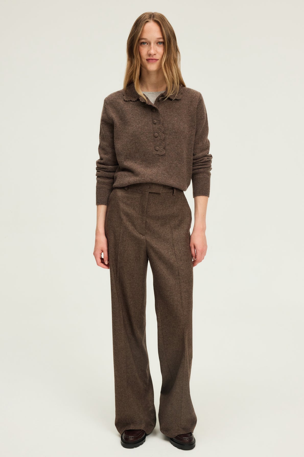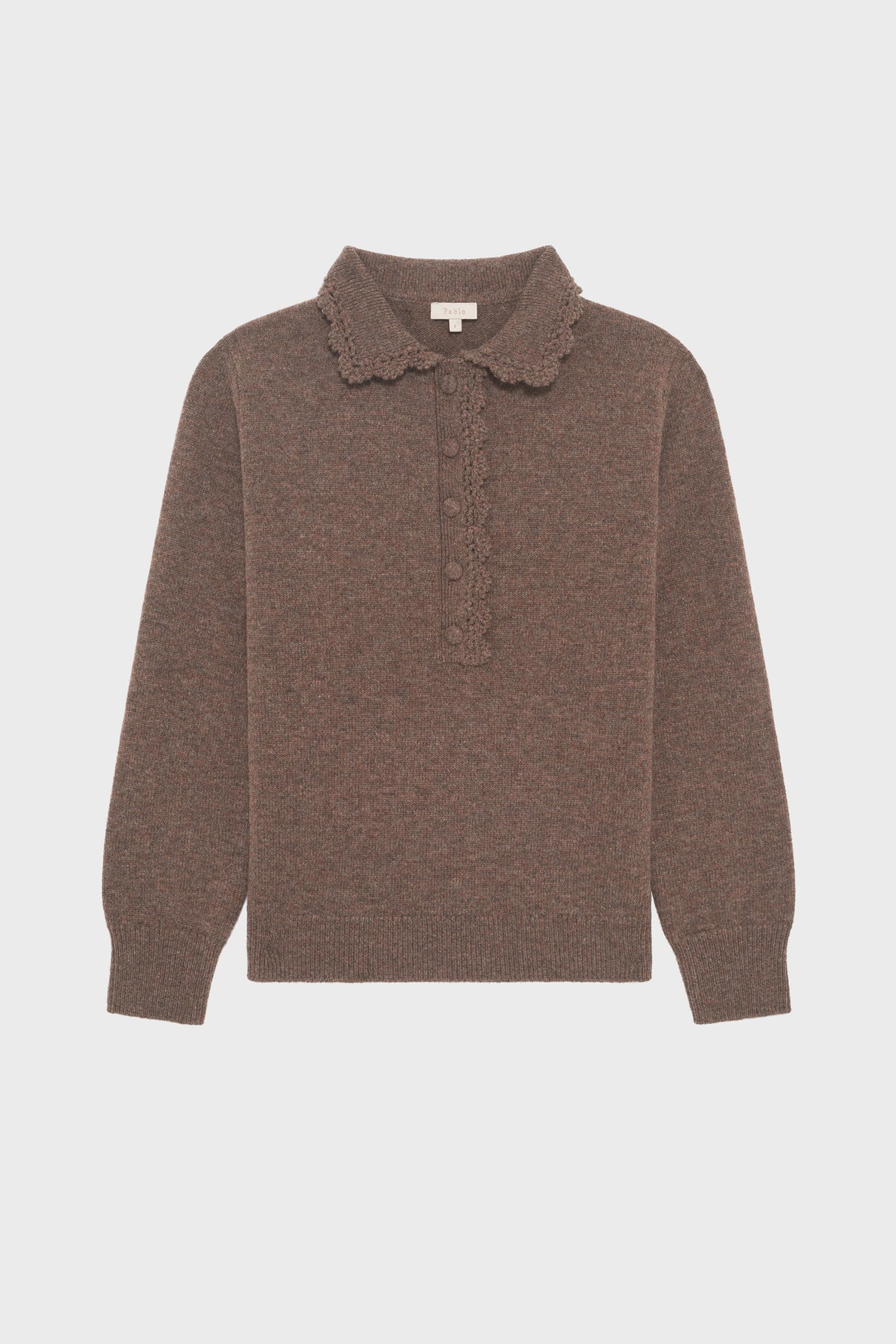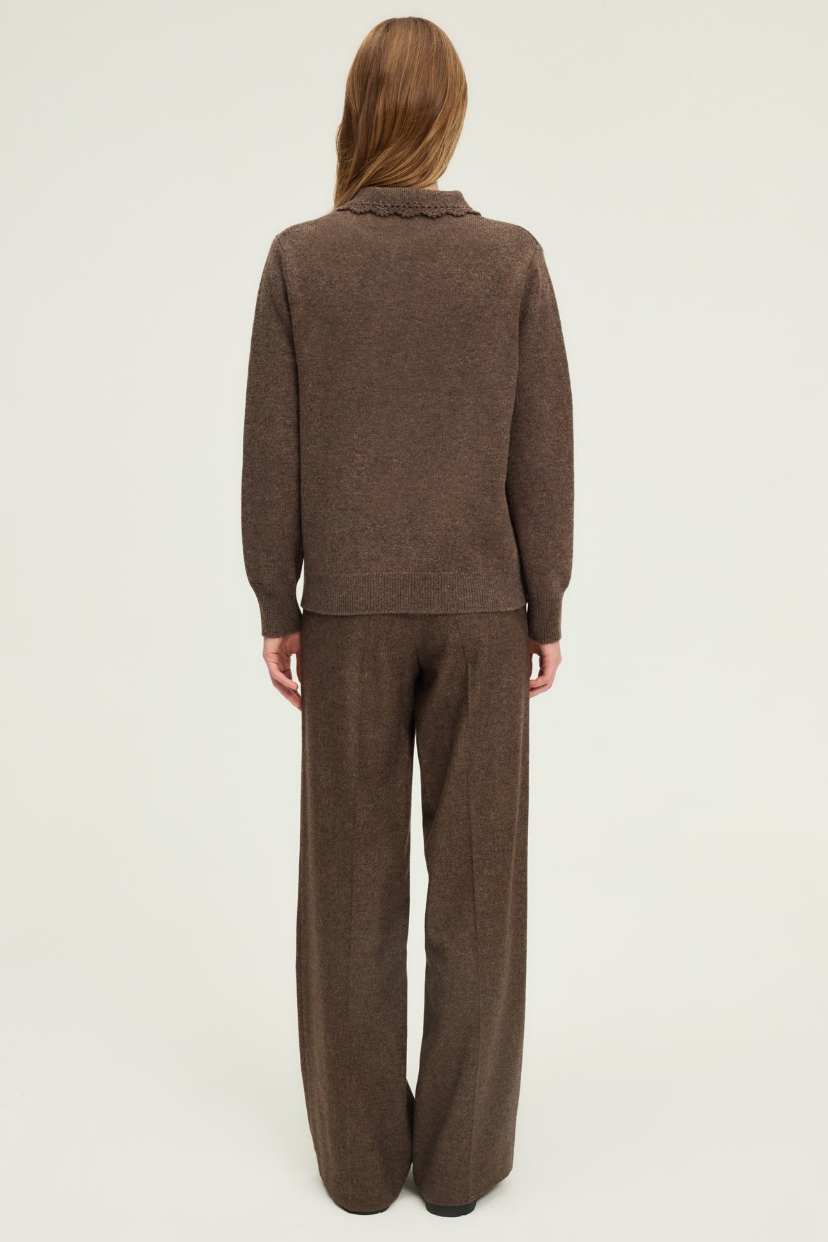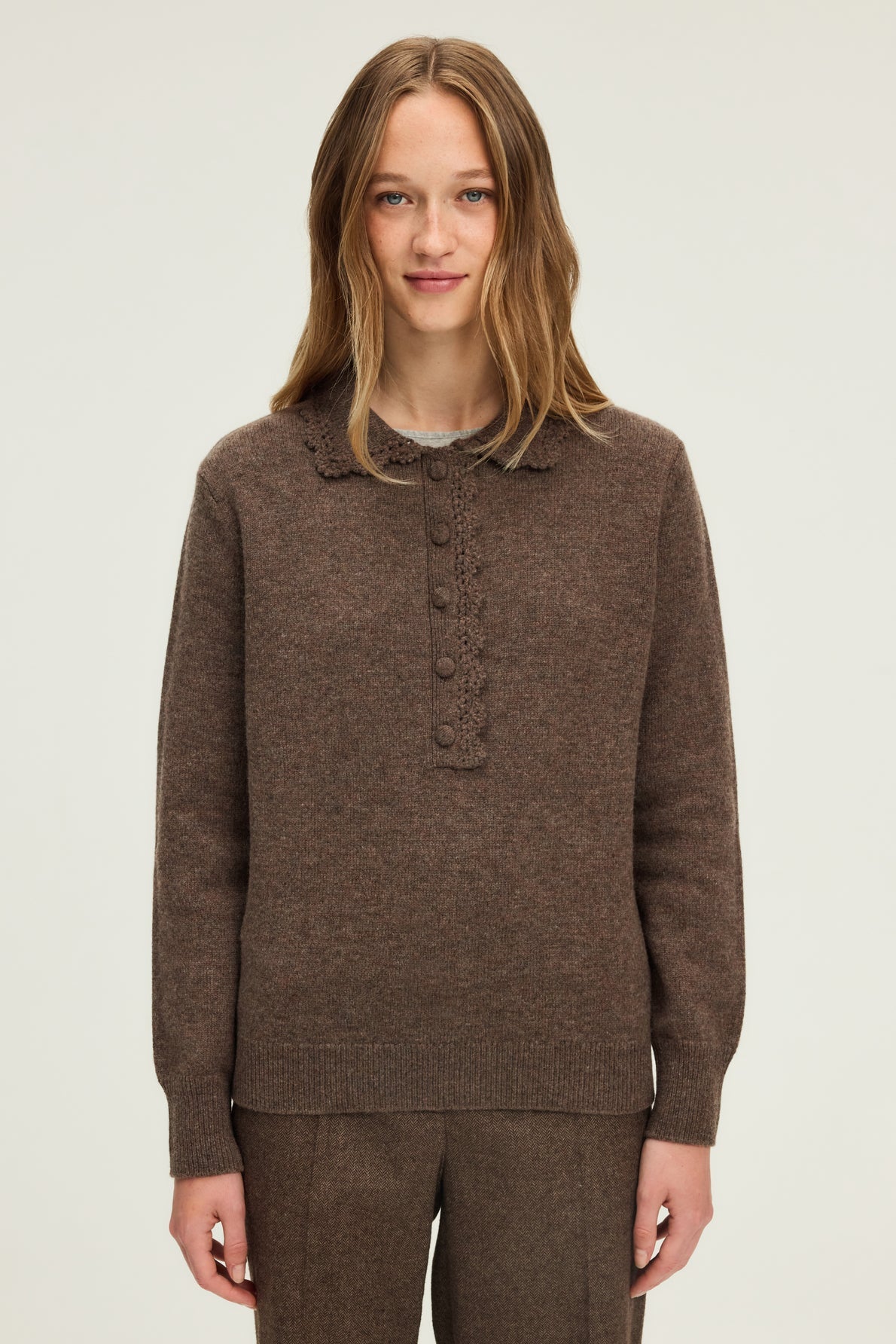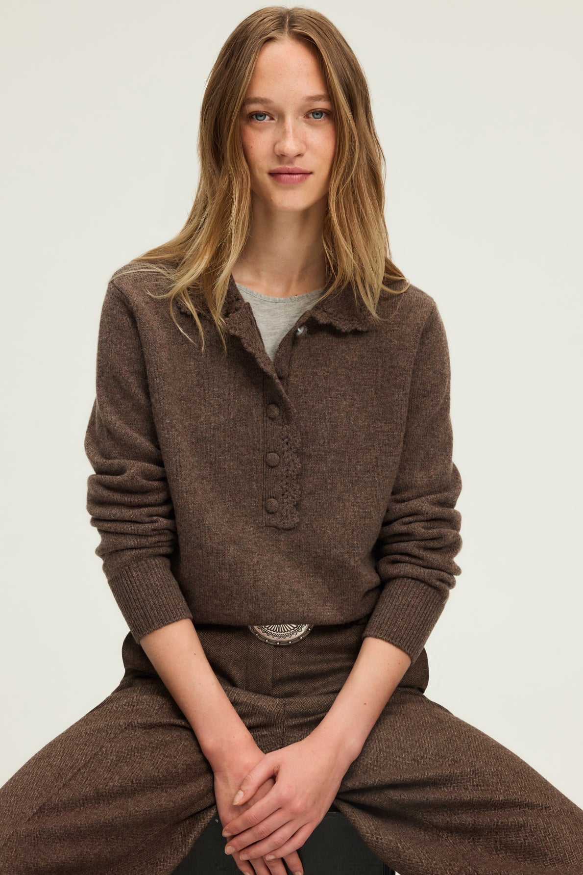 With its polo collar and neckline adorned with crochet patterns, this sweater will add a touch of whimsy to a simple outfit. Crafted from 100% merino wool in a chic and modern brown color.