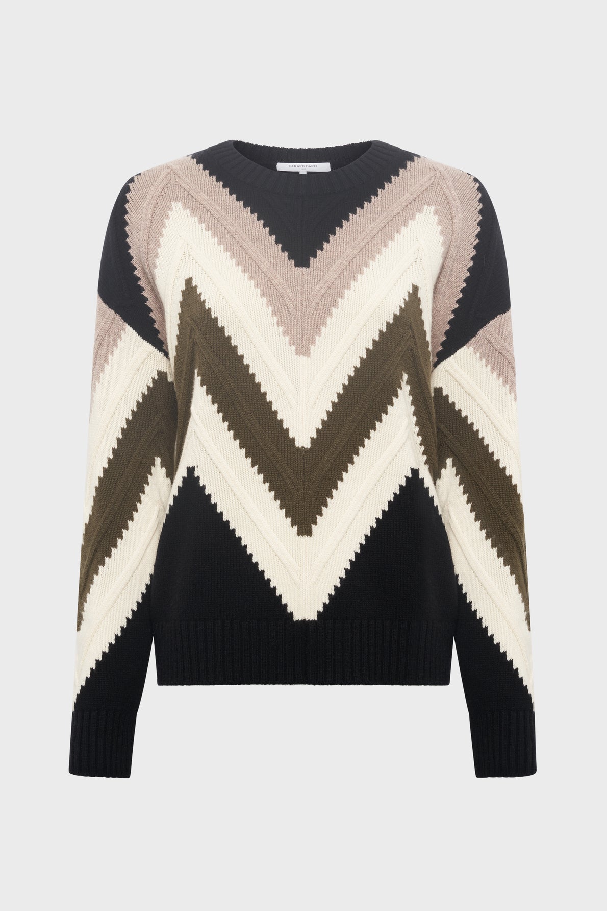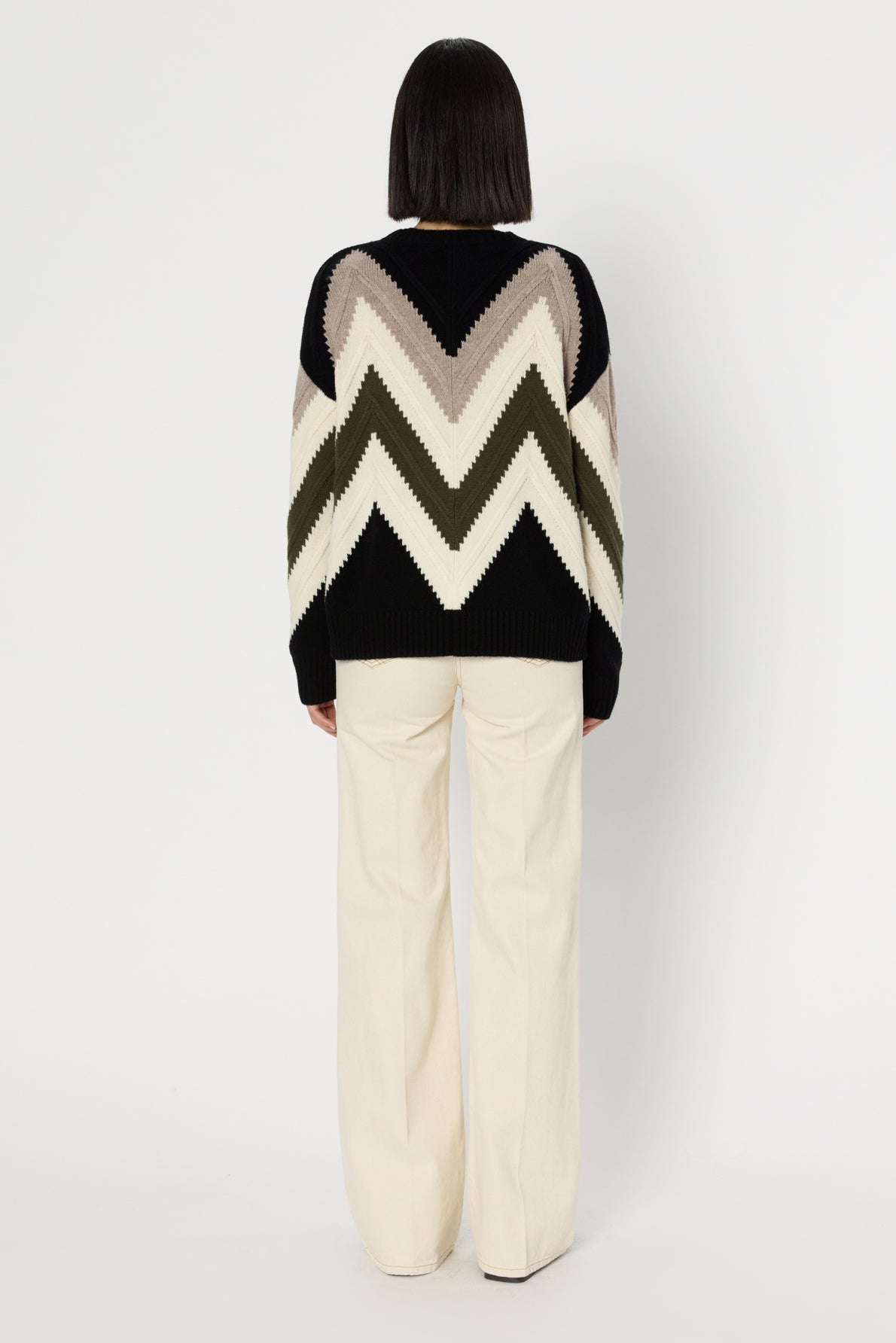 Sweater with large white, khaki and beige herringbones on a black background in a very contemporary graphic style. Made in 100% wool.