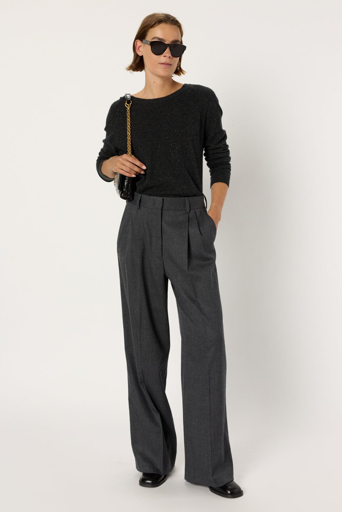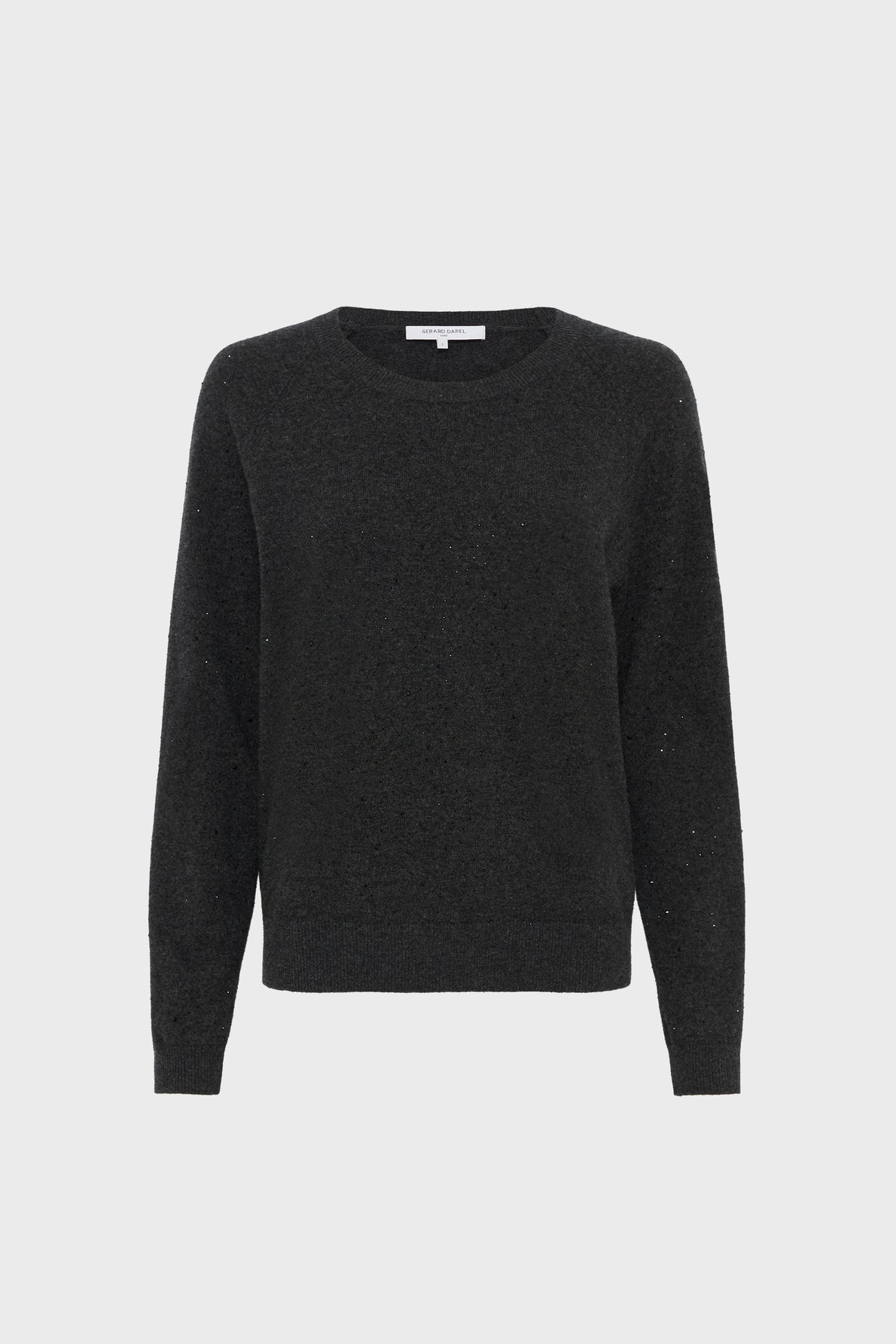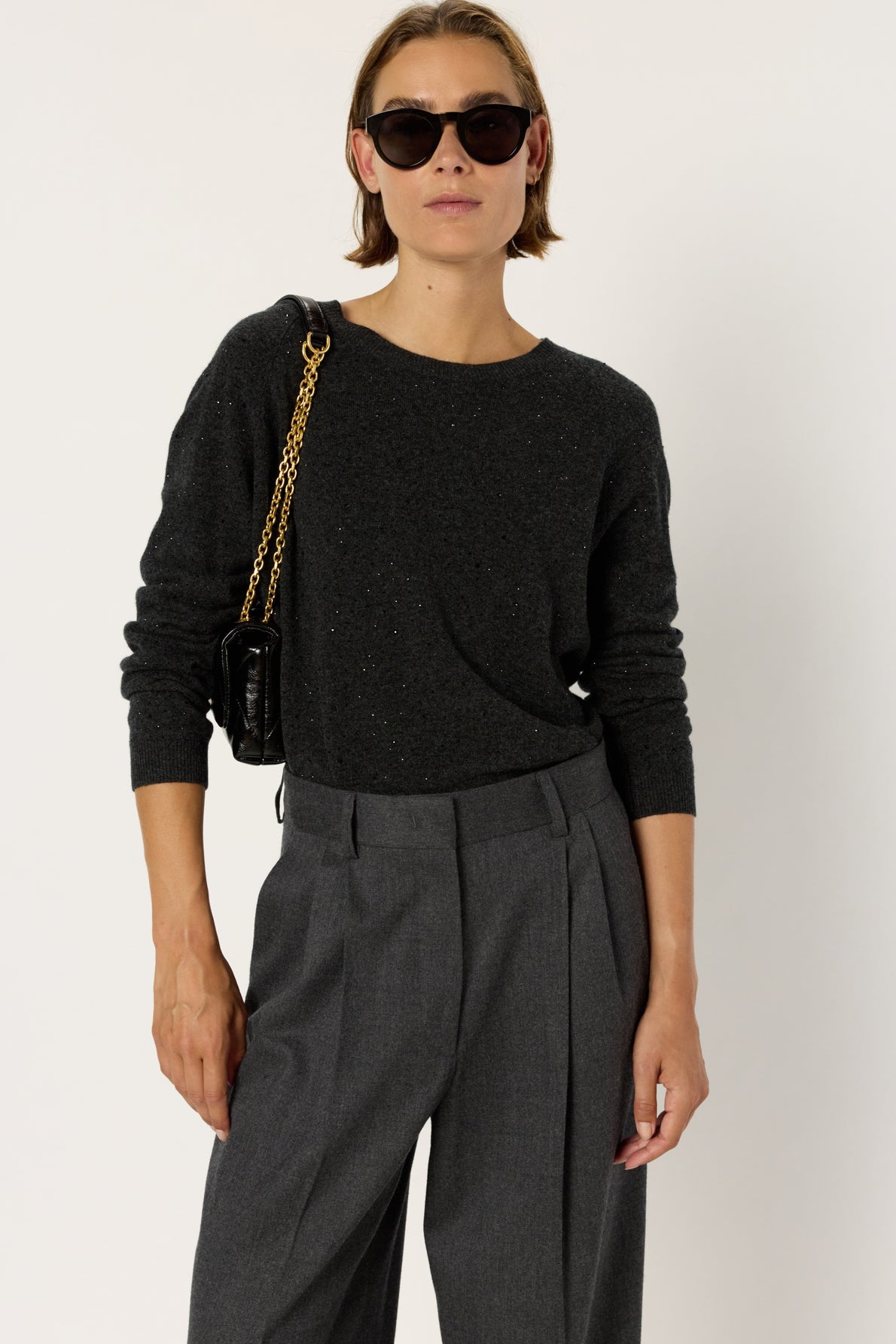 Plain charcoal sweater with mini black rhinestones for a sophisticated twist. 100% wool. • Straight cut • Plain wool with rhinestones • Raglan sleeves • Round neck • Long sleeves • Ribbed edges REFERENCE : DCU92C2297201