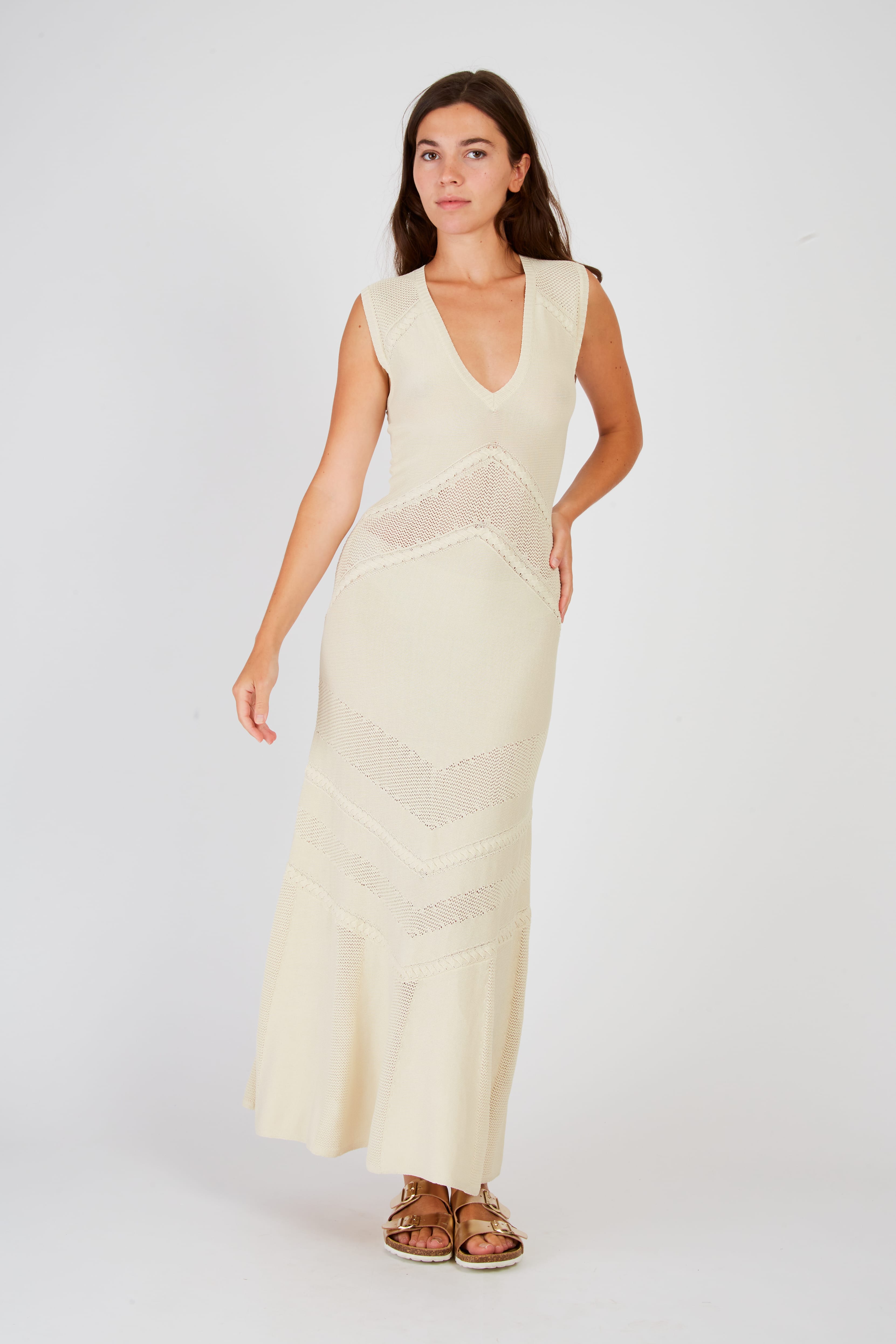 Long fine knit dress. Fitted and flared at the bottom. Sleeveless with a deep V-neck. Geometric crochet pattern alternating between opaque and sheer sections. Fluid and lightweight fabric. A perfect piece for an elegant and relaxed silhouette.